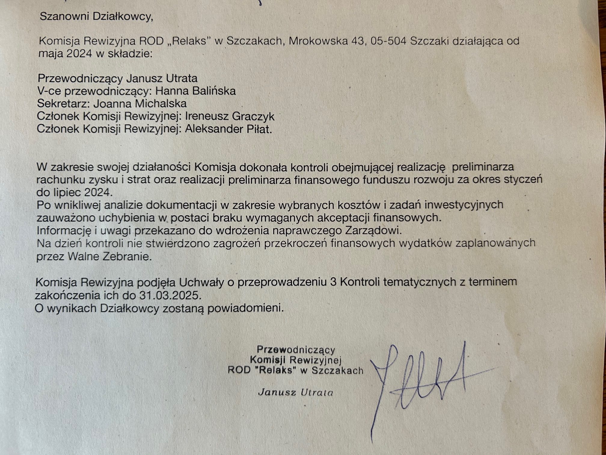 W imieniu Komisji Rewizyjnej ROD „Relaks” Przewodniczący Komisji Rewizyjnej