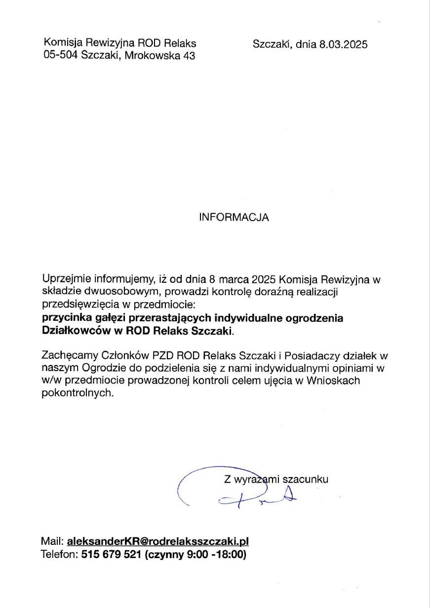 Komunikat nr 2 Komisji Rewizyjnej ROD Relaks w Szczakach z dnia 05. 08. 2023 roku